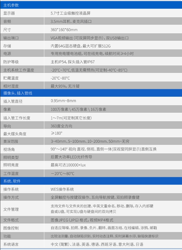 WLK-Y智能工业内窥镜,是一款高端智能内窥镜产品该型号配备5.7寸工业级显示屏,触摸按键双操作;百万级高清像素,还原真实图像色彩:可实现比较测量法缺陷自动识别、WIFI远程联通、直侧一体同屏显示、智能编辑图片等功能,可根据客户实际检测需要进行定制;适用于飞机发动机涡轮叶片、燃室裂纹、机体结构框架内部多余物的查找排除、各类油液管路焊接等内控表面缺陷检测,机体表面结构框架以及发动机的气红、燃料管、油压部件、喷嘴部件等部位的检测。